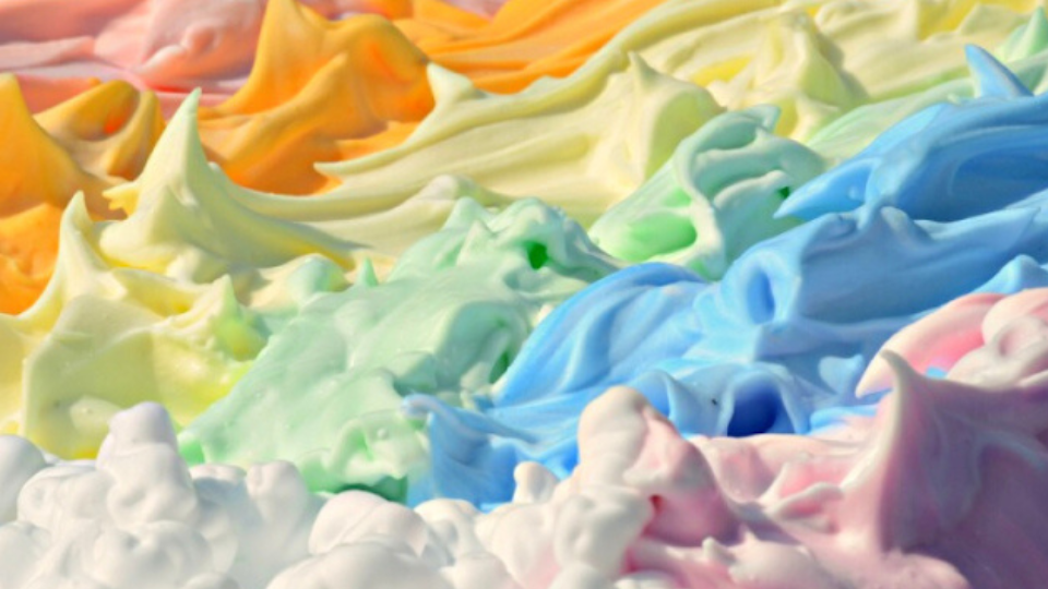 (1 cup cornflour, ½ cup foam shaving cream, food colouring)